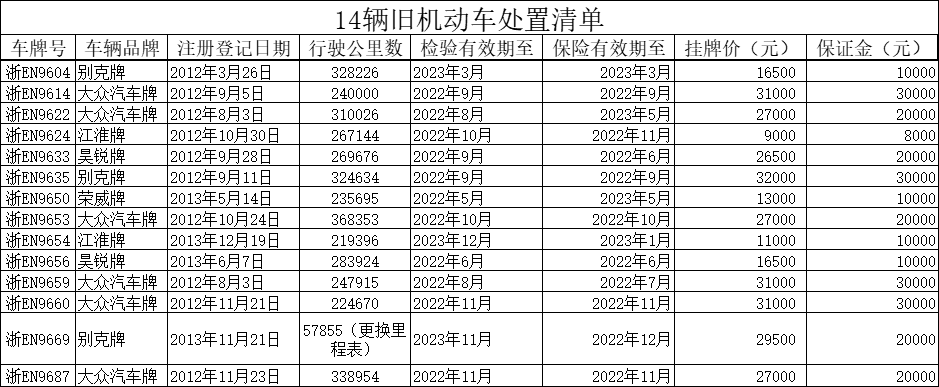 14辆旧机动车挂牌转让,详见清单。
