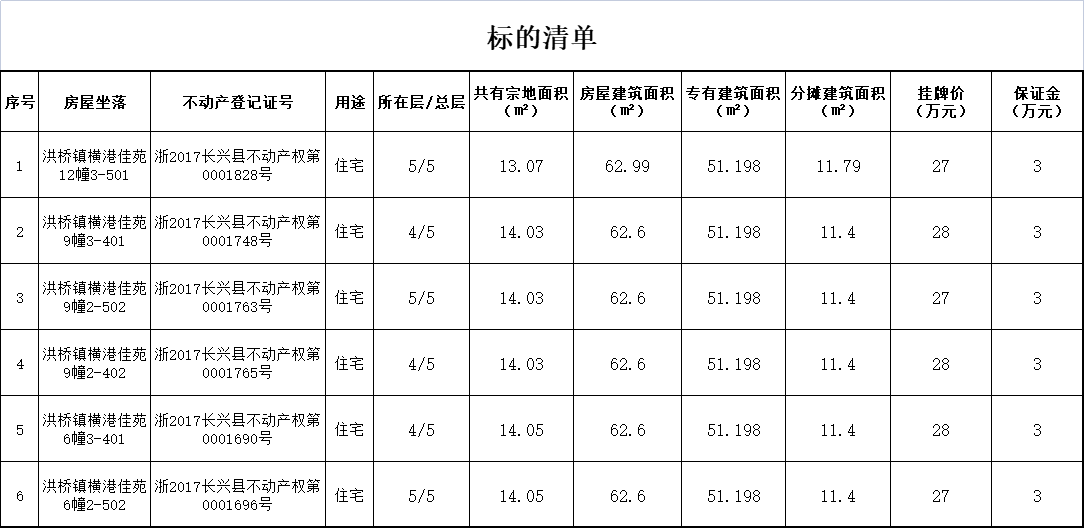 一标的信息:长兴县洪桥镇横港佳苑6套住宅,房屋挂牌信息详见《标的清单》。
